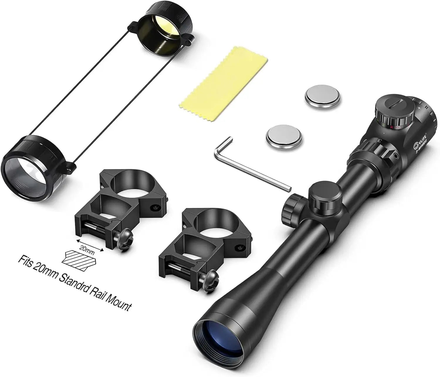 Accurate & Rapid Aiming: Capped reset turrets are finger adjustable with MOA clicks that can be reset to zero after sighting in. Windage & elevation click value: 1/4 MOA 1/4" @ 100yards, eye relief:2.95"-3.94".