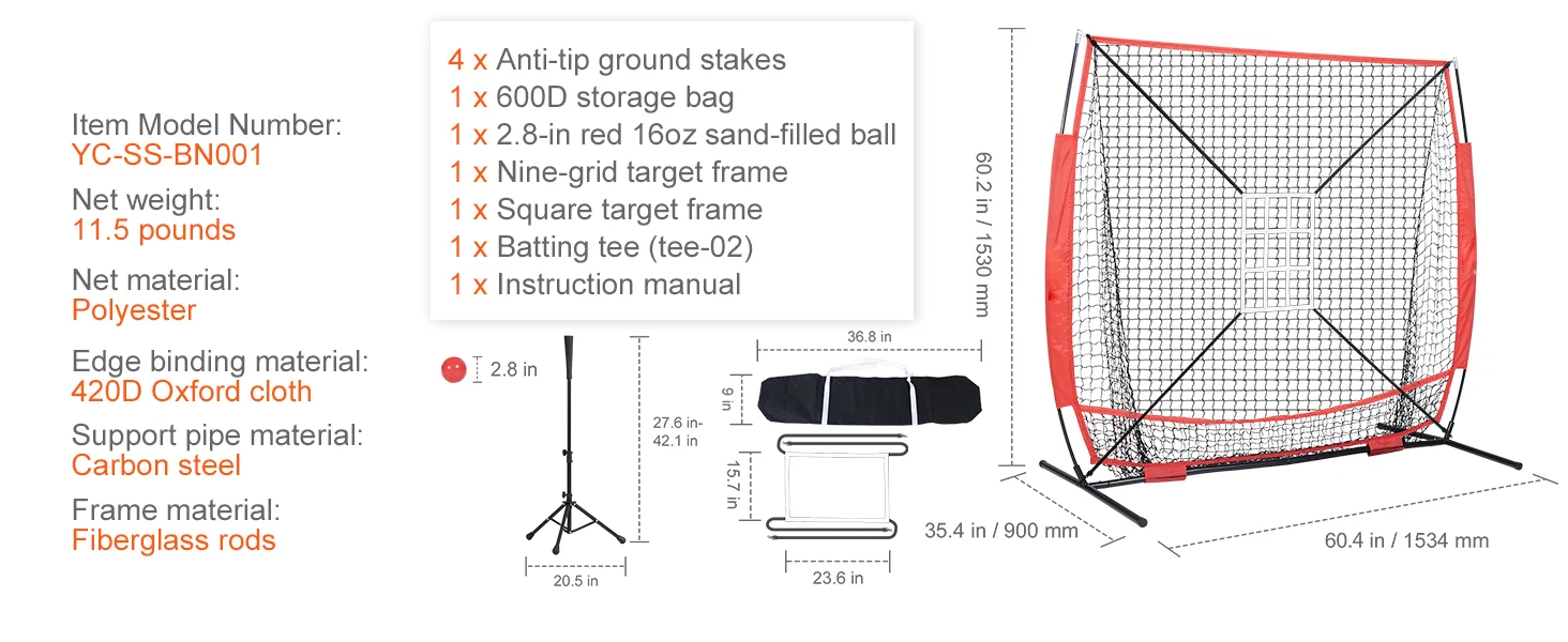 5x5ft Training Set: Beyond the basic net and support frame, this baseball softball practice net set also includes a square and nine-grid target frame, a tee stand, and a 2.8-inch sand-filled ball. Furthermore, it comes with a specialized storage bag for quick and easy packing. Suitable for both baseball and softball, the comprehensive accessories allow players to effectively practice pitching and catching, leading to rapid skill enhancement.